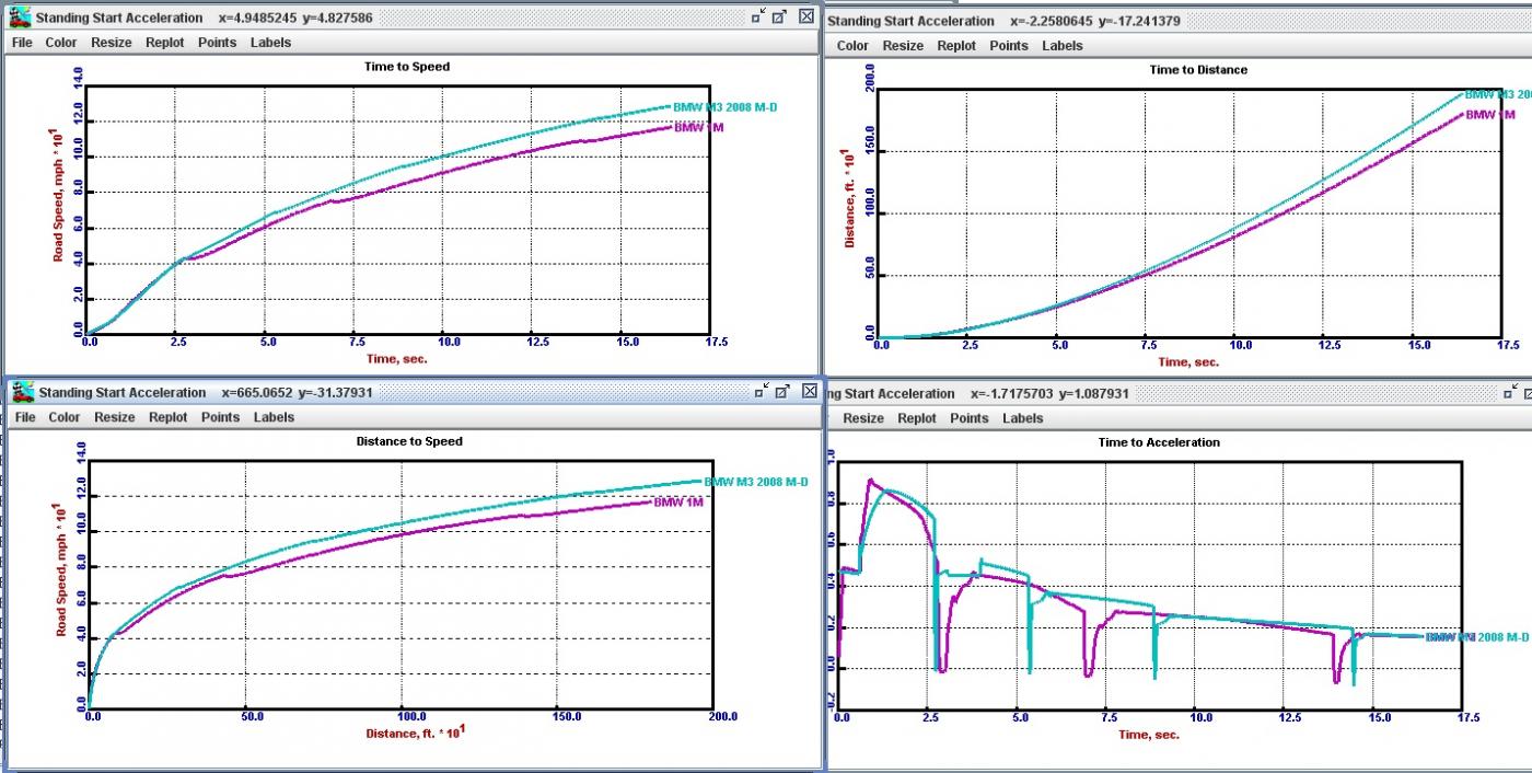 A much more informative way to look at a comparison of the cars is simply position vs. time, velocity vs. time or acceleration vs. time. What graphs vs. rpm can fail to fully represent is that except for the very brief pull to the shift point in 1st gear the M3 spends the vast majority of its times at a much higher rpm than the 1M, as such is is making more power for more of the time and hence accelerating more. A really rough range on WOT runs where the 1M spends its time is 5-7k rpm. The M3 is typically at 7-8k. I.e. it is operating where the 1M can not even reach from an rpm perspective! This emphasizes the importance of redline and hp over torque. The higher torque only really provides a performance advantage when you lug the M3 and use the wrong gear. For some particular speed contests such as low speed in high gear the 1M will win. Some describe this as a better daily driver type of characteristic whereas I perfer a better lazy driver. Here you can look at the accelerative force vs. speed (1st two graphs), noting that at each shift you simply drop down one curve right to the next. For instance in 2nd gear the M3 is almost always producing more than 2000 lbs of accelerative force whereas the 1M typically producing less than 1750 lbs (again during WOT runs). The M3s green curve for 2nd gear does not even see the part of the curve below or to the left of the peak when doing a WOT run! These curves take into account power, torque, gearing, a plethora of losses, weight, aero effects, tire slip, you name it. It is a very rich physics based simulation. Do note that on these force curves I could not force my software to use the same scale so that can be a bit misleading (4000 peak vs. 3500 peak). The radically downward sloping curves in the upper rpm ranges is that typical "running out of steam" feeling you get in a lower redline car with a much lower rpm torqe peak and narrow torque curve width. When it comes to who is ahead or who is going faster that should be painfully obvious from the cars power to weight ratios. The next set of graphs only make it obvious. Not really much of a contest here. The M3 is ahead, always ahead and ahead from a distance or speed perspective. The only possible exception to this would be that somewhere in middle of the short 4 or so seconds to 60 mph the 1M might get just a few feet ahead of the M3 but by 4 seconds the M3 will have gained almost a wheelbase on the 1M. Just for reference my 0-60 and 1/4 mi. times predicted for the 1M using this software were 4.6s and 13.1s respectively. The car might be underrated a bit by BMW like the 335i and in which case it wil fare a bit better but the trends won't be reversed. Not much tweaking of input parameters to the software was needed here nor was a super precise dyno curve required. Having those again would nudge curves very slightly here or there but no major change would result. Also note I have used the M-DCT M3 for comparison not the 6MT. You can see that by the very short shift times compared to the MT.