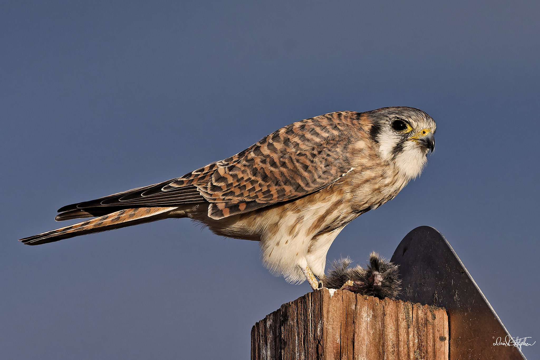 I've been watching this kestrel for several weeks and know several of its favorite perches, near Jordon Rd, in Cherry Creek State Park, Colorado. On my way to work, I always check to see if its on one of the perches and I'm often rewarded with a shot. So knowing your subject is important. Also, being patient and waiting the 15-minutes for it to spot potential prey and take off is essential. Kestrel are surprisingly tolerant and are not disturbed as I sit in my car, close by, while other cars pass and some pedestrians come close, so long as they're not too close and don't focus on the bird. I can't ID that bird-prey from underneath, but I think it's a chickadee or a sparrow. It's a bird-eat-bird world. The kestrel has to constantly watch for Merlin, Cooper's hawks, red-tails hawks and others that might eat it.