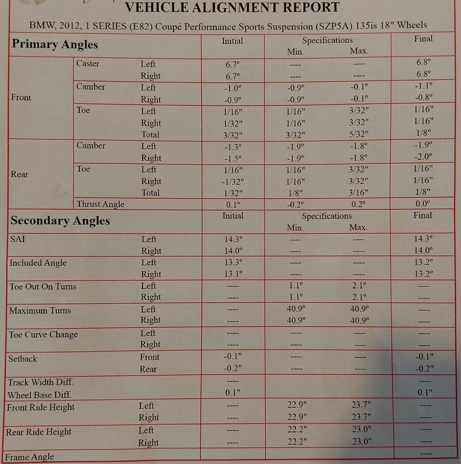 I did buy the car used. Good news is that the car drives fine. They did push the rear camber out and actually let me have 0.1 over on one side. I also noticed they used the spec for the 135is (mine is an M-sport). Not sure if that matters. This should be fine for the last two track days of the year...next year I may spring for a custom suspension setup, including camber plates and figure out how to do all this myself... Results: ![]()