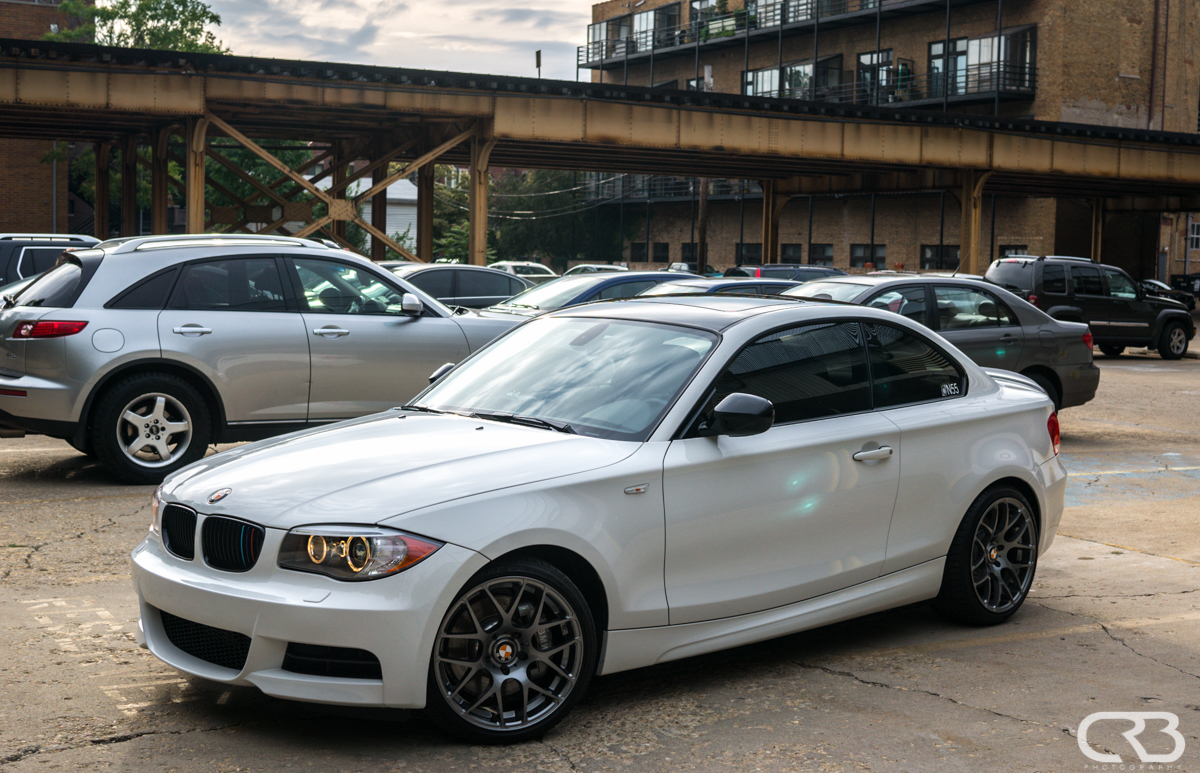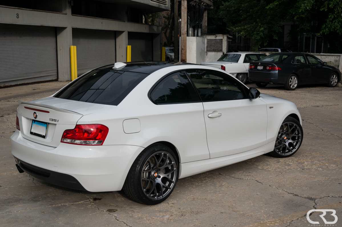 2011 JB E82 135i - Premium pack | Value pack | Premium sound | Sport pack | M-Sport steering wheel and suspension | Blackline LCI tail | BMWP carbon spoiler | BMWP CF license frame | BMWP gloss black grilles | Meisterschaft GT w/gloss black tips | CF diffuser | CF splitters | Hyper Black Apex Arc-8 w/Potenza RE-11 | Dinan camber plates